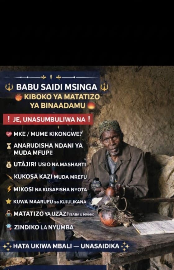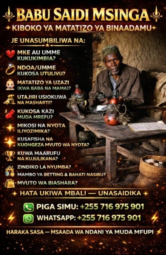 Karibu katika kituo rasmi cha Babu Saidi Msinga, mtaalamu maarufu wa tiba asilia mwenye uzoefu wa miaka mingi katika kutatua changamoto zinazowasumbua watu wa rika zote. Hutumia tiba za asili, baraka za jadi, na utaalamu wa kizazi kwa kizazi kukupa faraja na mafanikio ya kweli katika maisha.